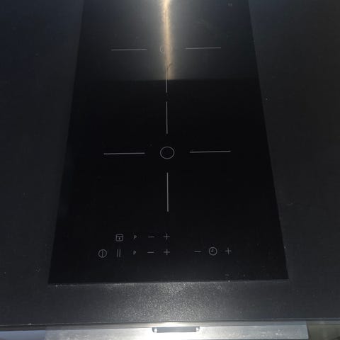 Innebygd ovn med funksjon for varmluft. Ovnens design inkluderer rustfritt stål og glass, med betjening via to knotter. Egnet for standard kjøkkeninstallasjon.