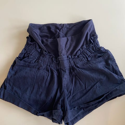 Pakke med 3 mammashortser. 2 dongerishortser fra HM, en i blå og en i svart. Og en sykkelshorts fra Blacc. Alle er størrelse small. Behagelige å gå med og supre om sommeren med plass til gravidmagen :) Pent brukt.
