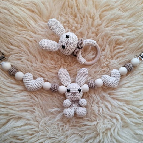 Ny og ubrukt barnevognlenke laget av 100% økologisk bomull med håndlagde, heklete figurer i nøytrale farger. Passer til bruk på barnevogn for å underholde barnet under turer. Kjøpt på Illums bolighus, merke er Franck og fischer.