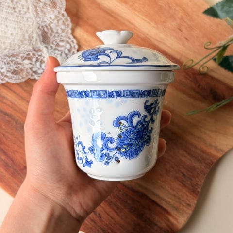🫐 Vintage salt- eller pepperbøsse i porselen med håndmalt blå dekor