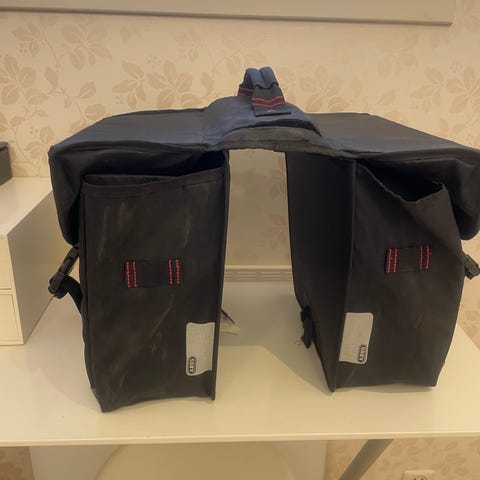 Abus sykkelvesker i svart farge med rødt innvendig fôr. Vesker med glidelås og håndtak for enkel bæring. Designet for å festes på sykkel. To regntrekk følger.