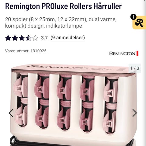Remington PROluxe H9100 varmeruller med rask oppvarming og avansert varmestabilisering for jevn varmefordeling. Settet inneholder 20 varmeruller i to størrelser: 8 stk på 25 mm og 12 stk på 32 mm, alle i rosa farge. Varmerullene har keramisk belegg og leveres med 8 ruller, 12 ruller og klemmer. Passer for styling av hår med jevn varmefordeling og inkludert klemmer for enkel bruk. Kjøpt med drømmen om krøllete hår, men aldri prøvd, og selges derfor videre. Mangler originalforpakning, den måtte vike under siste flytting. Har derimot bruksanvisning