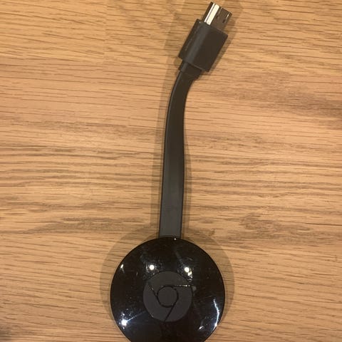 Google Chromecast 3 med HDMI-kabel og strømadapter for tilkobling til TV. Enheten gjør det mulig å strømme innhold fra kompatible apper til TV-skjermen via trådløs tilkobling.