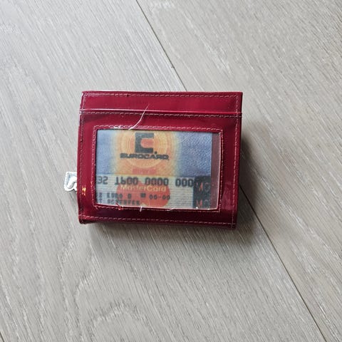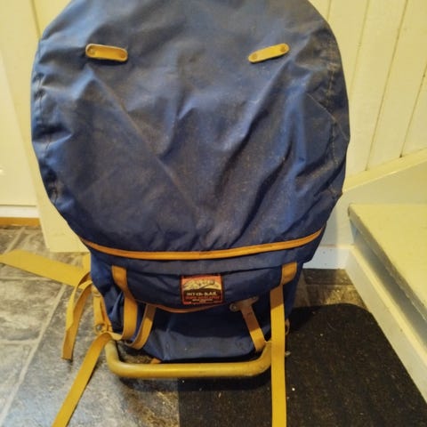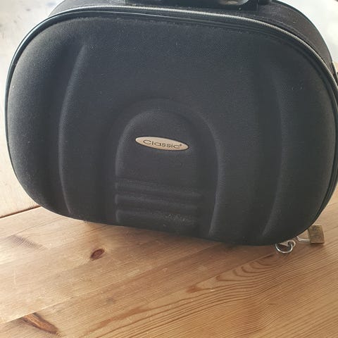En stor lomme inni og par små foran. Glidelås rr dessverre ødelagt, har aldri vært brukt. Ca 18 x 44x34