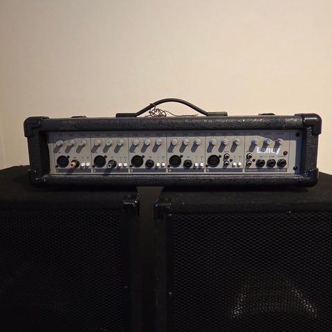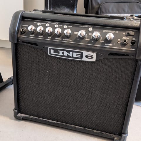 Pent brukt gitarforsterker. Virker fint, har mange tilkoblingsmuligheter, bl.a mikrofon. Følger med en litt avansert fotkontroll og.