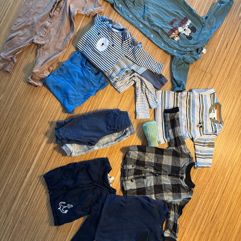 Selger pent brukt klespakke merinoull str 74 fra Reflex. Lite hull på kne høyre grønn bukse.