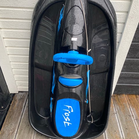 Frost akebrett med ratt og sete i blå og grønn designet for barn laget av plast og metall. Den andre er rød akebrett er i god stand.