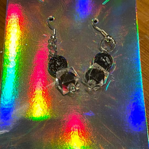 Håndlagde øredobber laget av perler og små glassdetaljer. Lette, elegante og behagelige å bruke – passer både til hverdags og som gave. I god stand.