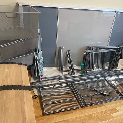 Elfa skyvedørsgarderobe med speil og Elfa kurver.