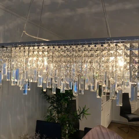 Denne modellen passer perfekt over spisebordet, i gangen eller i stuen. Den kombinerer et klassisk krystall-uttrykk med rene, moderne linjer i krom.