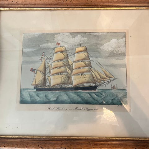 Størrelse 109 x 45. Flott hvit og gull-lasert ramme , hel og fin. Kan sendes.