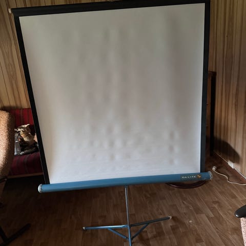 I fin stand. Sammenleggbart lerret fra 1970 tallet til lysbilde fremvisning.