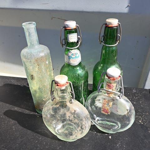 6 gamle flasker. Den grønne kan ikke stå, må lenes mot noe. Selges samlet.