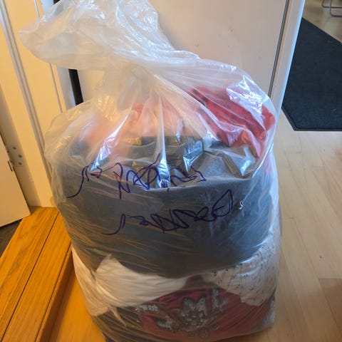 Selger en søppelsekk med bukser/jeans, skjørt og shorts.