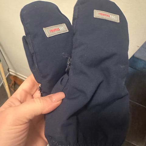 Størrelse er ca str 3-4 år, hjemmestrikkede og helt nye. Se siste bilde for lengde på vott og tommel.