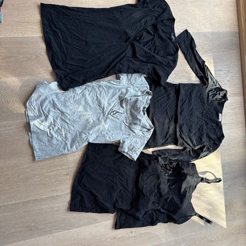 Gravid-tskjorter (strl S, M, S) singletter (strl M), bluser (strl M) og pysj (strl M) - perfekt når graviditet om våren/sommeren. Passer til hverdagsbruk og kan kombineres med ulike antrekk. Liten gul flekk på hvit t skjorte som gis bort, kan sikkert vaskes vekk med sitronsåpe. Selges for 35kr per del, 280kr samlet.