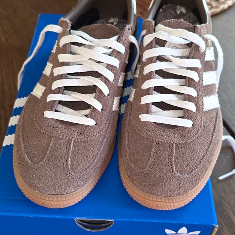 Adidas Sneakers joggesko i størrelse 39 1/3. Skoene har en brun farge med hvite detaljer og snøring. Materialet ser ut til å være en kombinasjon av semsket skinn og tekstil. Egnet for daglig bruk og fritidsaktiviteter.