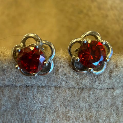 925 sølv øredobber med rød glassperle med gul dekor, og dekorert, oksydert "blad" under.