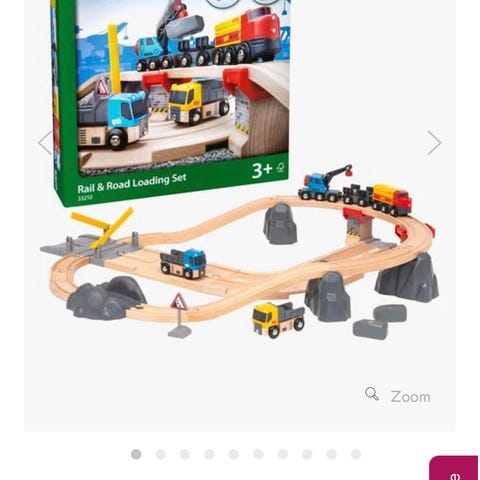 Settet inkluderer kurvede og rette skinner, broer med rekkverk, et togstasjonshus, brannstasjon, garasjer, båt/ferje og flere små figurer som mennesker og dyr. Materialet er tre, og produktet er utviklet for barn.