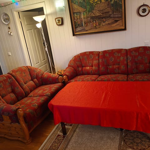 Hjørnesofa med stol i rødt velvetlignende stoff. Litt vanskelig å få heilt riktig farge på bilde. Fint brukt. Lang side er 280cm