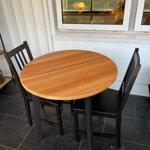 Godt brukt, men solid spisebord selges. Spisebordet har en innleggsplate som oppbevares i selve bordet, og gir da en lengde på omtrent 203 cm. Det er mye småmerker i bordet, se bilder for eksempler. Bordet er ganske tungt og står veldig stødig både med og uten ekstra plate.