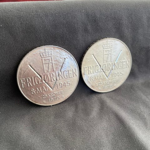 3 stykker frigjøringen 25 År, 25 kroner 1970, sølv, uåpnet i plast