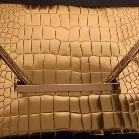Selger en stilren sort clutch med en iøynefallende trekant-detalj i gull på flappen. Denne er perfekt til fest, bryllup eller en kveld ute!