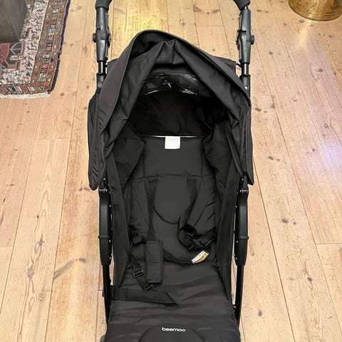 Beemoo barnevogn i svart farge. Barnevognen har justerbar ryggstøtte, sikkerhetssele og hjul som egner seg for variert underlag. Passer for barn og gir god støtte under transport.