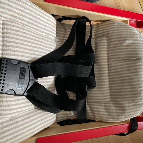 3 punkt stropp: rundt mage og mellom beina. Samt stropp som går under stolen.