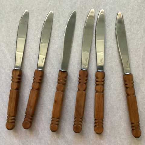 6 stk retro fruktkniver i rødt, gult og grønt.