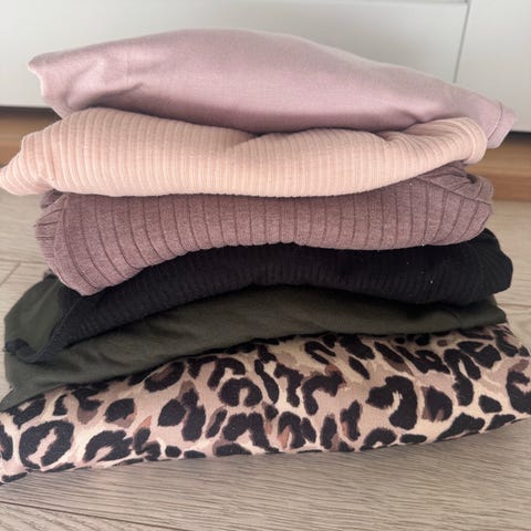 Selger unna en pakke med tynne gensere som har blitt for store. Pent brukt. Fra cubus og h&m. Spør om det er noe.