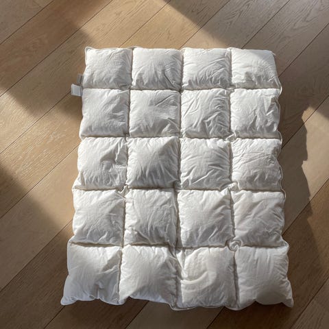 Babydyne i dun fra Kid og pute fra tysk merke AHO Baby. Produktet består av en dyne og en pute, beregnet for baby. Materialet er vaskbart, og produktene er laget med tanke på barnets komfort og sikkerhet. Dynen har mål 65x80cm og puten 40x60cm. Lite og ikke synlig brukt. Begge deler er med rent dun.