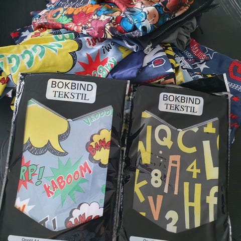 Har forskjellige ubrukte bokbind i stoff til 10 kr stk. Har også tekstiletiketter til, hvis man ønsker dette.