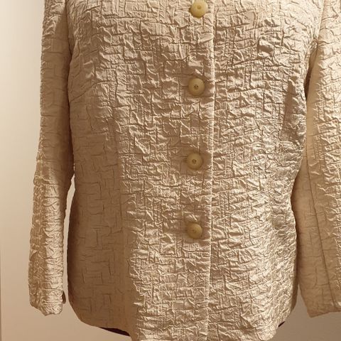 Beige penjakke i str 46. Virker noe mindre i str, men spør gjerne om mål. Detaljene er sorte. Kvinnelig passform. Med skulderputer.