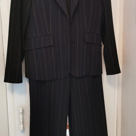 Bukse og blazer fra Co Couture med pinstripe. I en brun/grå farge. Blazeren er Oversized i passformen og buksen er rett og noe flared i fasongen. Kun brukt et par ganger.