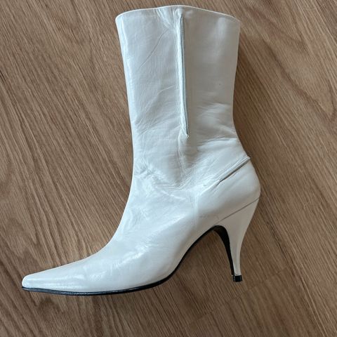 Buffalo støvler i størrelse 36, hvit farge. Støvlene har spiss tupp og lav hæl. Materialet er mykt, og de har en dekorativ stropp med metallring på siden.