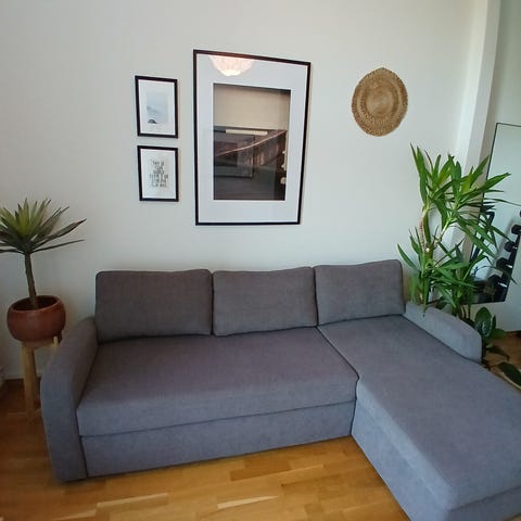 Selger en hjørnesovesofa fra IKEA med sovefunksjon og oppbevaring.