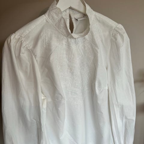 Meget flott hvit bluse med broderte detaljer og silkebånd. Pent brukt. Normal i størrelsen