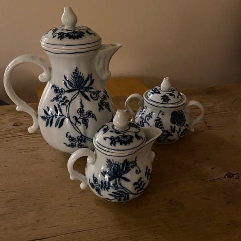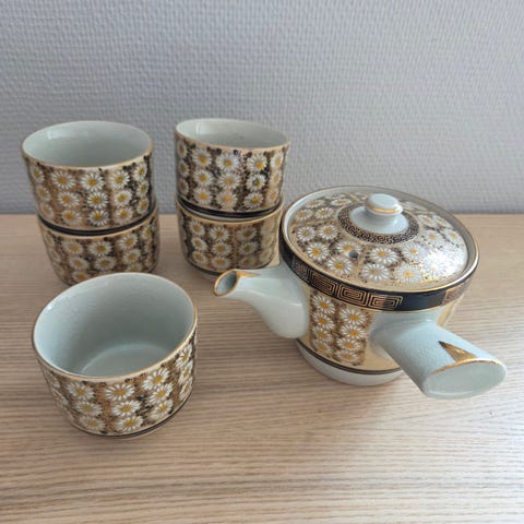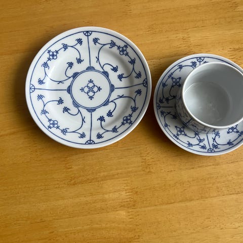 Serviset består av 6 kopper, skåler og asjetter, er helt og pent uten skader.