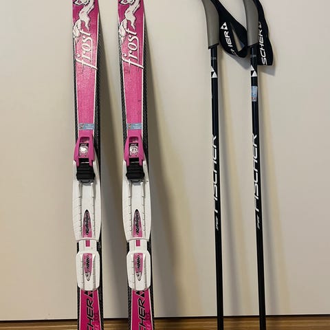 Godt brukte Fischer langrennsski med lengde på 100 cm. Skiene har Rottefella NNN bindinger. Medfølgende staver er 70 cm lange, med håndtak og stropper.