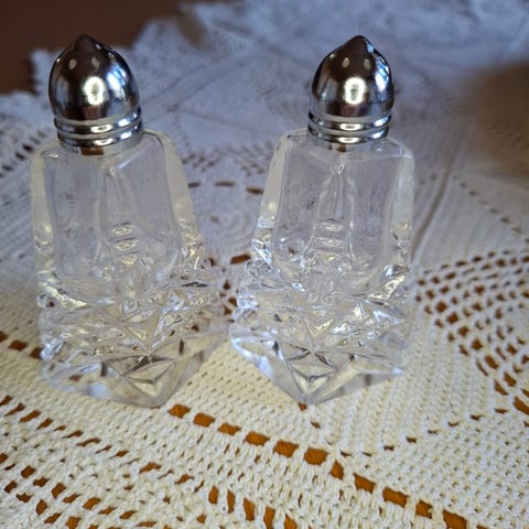 Et nydelig vintage sett med salt og pepperbøsser i glass med serverings kurv i sølvplett med håndtak
