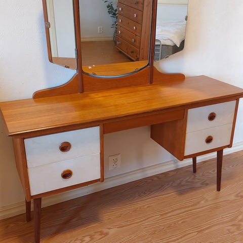 Fint og Stiligt sminkebord uten nevneverdige skader - men trenger litt god Teak-olje