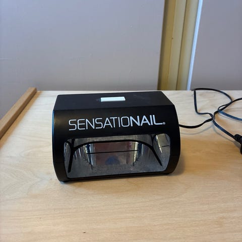 SensatioNail LED-lampe med tilhørende gel neglelakk i flere farger. Inkludererlader og diverse tilbehør for påføring og herding av gel neglelakk.