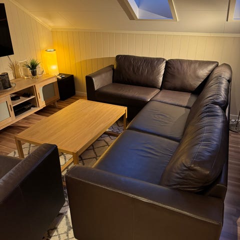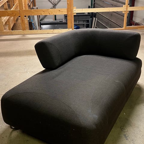 Sofaen er 345 cm bred, og hver sjeselongdel er 205 cm. Hentes av kjøper.