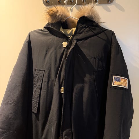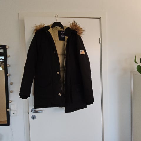 Svea Vinterjakke i størrelse L, farge svart, laget av dun. Jakken er designet for menn og egnet for utendørs bruk i kalde værforhold.