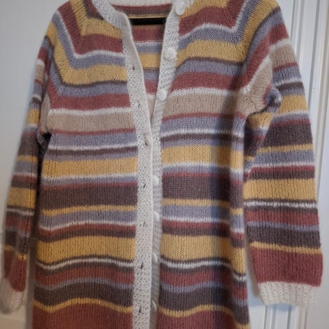 Brukt 1 gang men knallkul jakke som kan has åpen og igjen som en genser med kule sløyfedetaljer.Strikket i Farytale garn