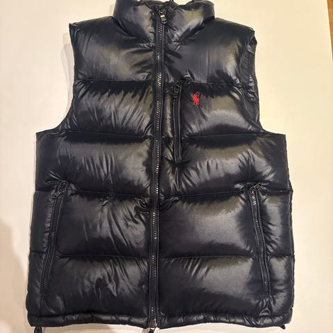 Ralph Lauren Polo vest i størrelse S, . Vesten har grå farge og er designet for menn. Den har glidelås foran og lommer, egnet som et lett ytterplagg.