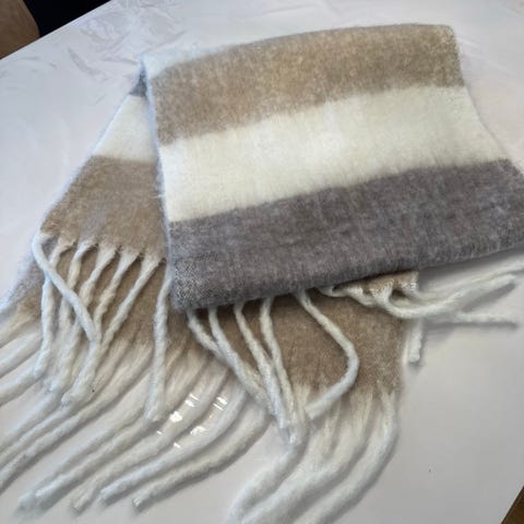 Skjerf i blå farge med dekorativt mønster og frynser i endene. Passer for menn og kvinner,størrelse XL er oppgitt, men skjerfets størrelse kan variere da det ikke er et klesplagg.