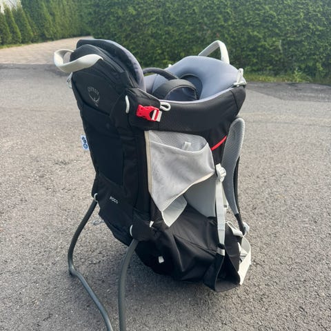 Osprey bæremeis i svart farge. Designet for å bære barn komfortabelt og sikkert under turer. Utstyrt med polstrede skulderstropper, justerbare belter og flere lommer for oppbevaring. Passer for utendørs bruk og vandring med barn.