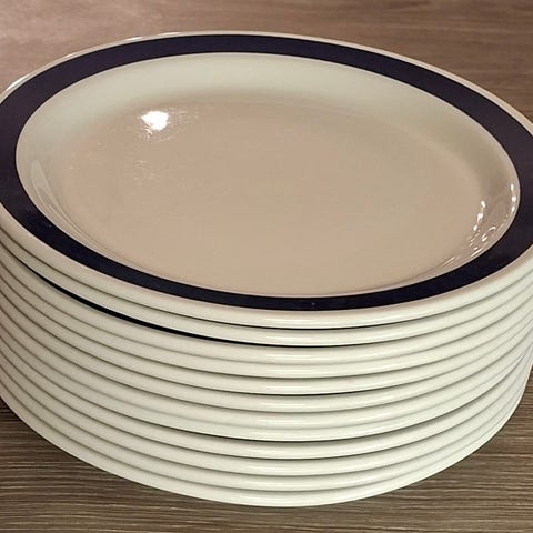 Selger 14 stk pent brukte Figgjo of Norway middagstallerkener med blått og grønt mønster på kanten. Tallerkenene er laget av porselen og har en rund form. Egnet for servering av mat i hjemmet eller til daglig bruk.